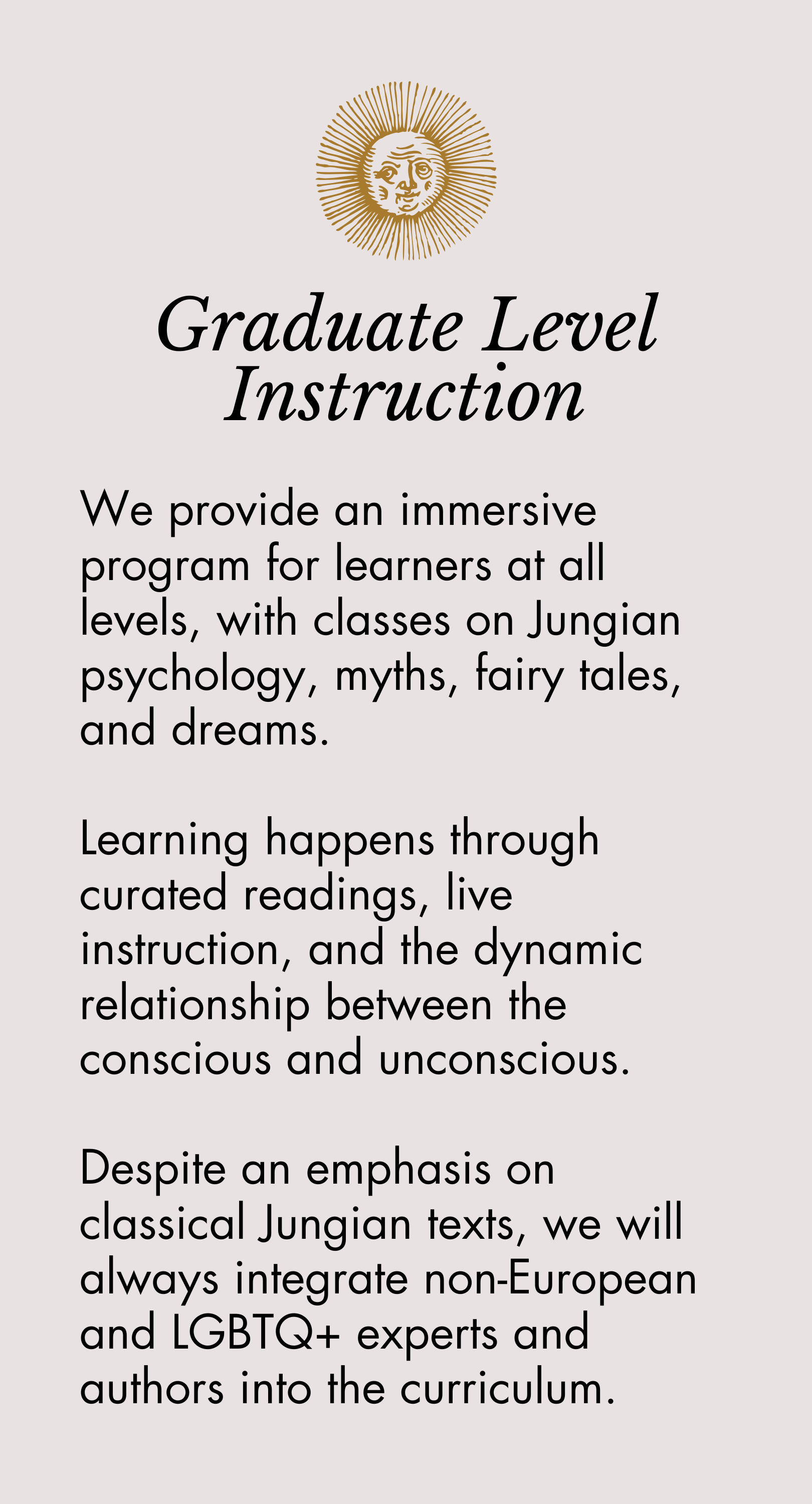 The focus is on fostering an ongoing mastery and internalization of a Jungian approach, regardless of each person’s originating knowledge base. The learning will be immersive and embodied, versus purely conceptual.